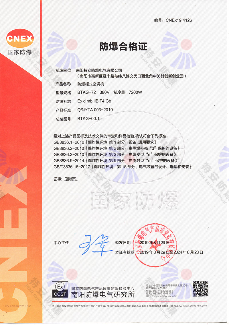 防爆空調(diào)CNEX防爆合格證 3C證書