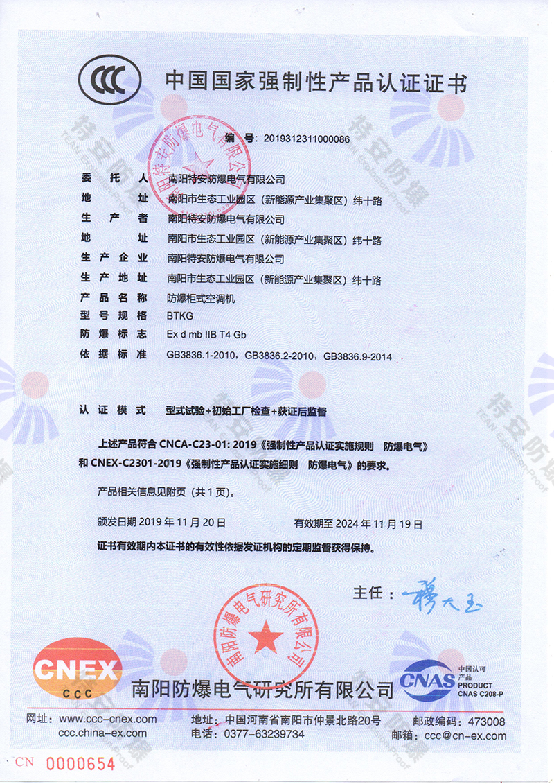 防爆空調(diào)中國國家強(qiáng)制性認(rèn)證證書(3C證書)