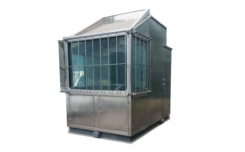 7.房體為不銹鋼材質(zhì),底座為普通鋼材,操作臺(tái)為不銹鋼結(jié)構(gòu),防爆電控箱,采用夾膠玻璃,頂層帶有可翻轉(zhuǎn)的防護(hù)不銹鋼絲網(wǎng),注意必須防水,前部和四周玻璃處均設(shè)安全防護(hù)欄。所有玻璃均安裝百葉窗(頂部除外)。